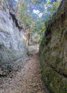 この切通の最大の見どころは、迫りくるような岩盤のオーバーハングです。住宅街を抜けた瞬間に現れる垂直な土壁と、頭上を覆う木々のコントラストは、まさにタイムスリップしたような感覚を与えてくれます。また、近くには素掘りの隧道(トンネル)も点在しており、探検気分を味わえます。